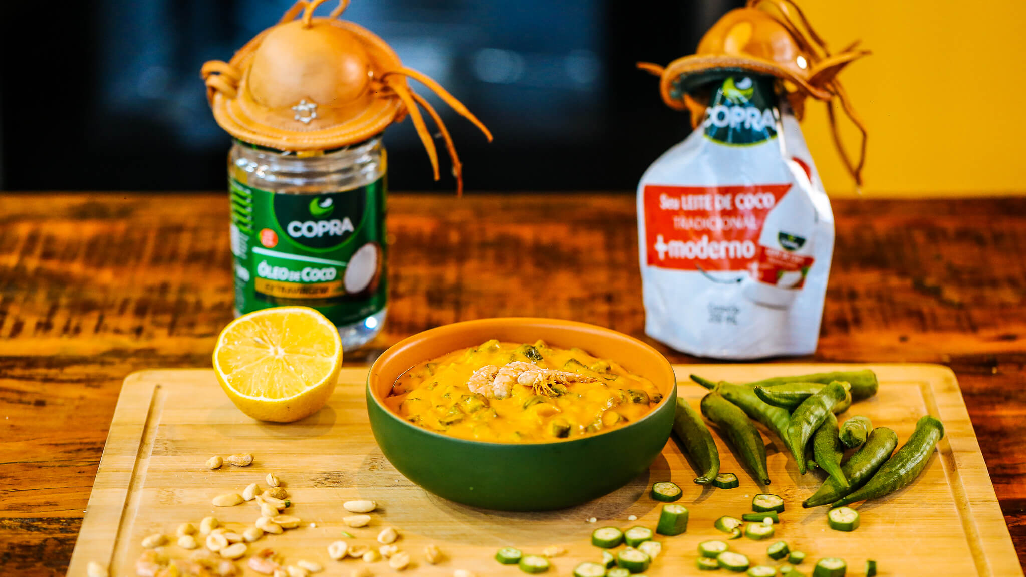 • Mantenha em fogo médio e adicione o óleo de coco, o azeite de dendê e o restante dos camarões. Mexa por uns 25 minutos.